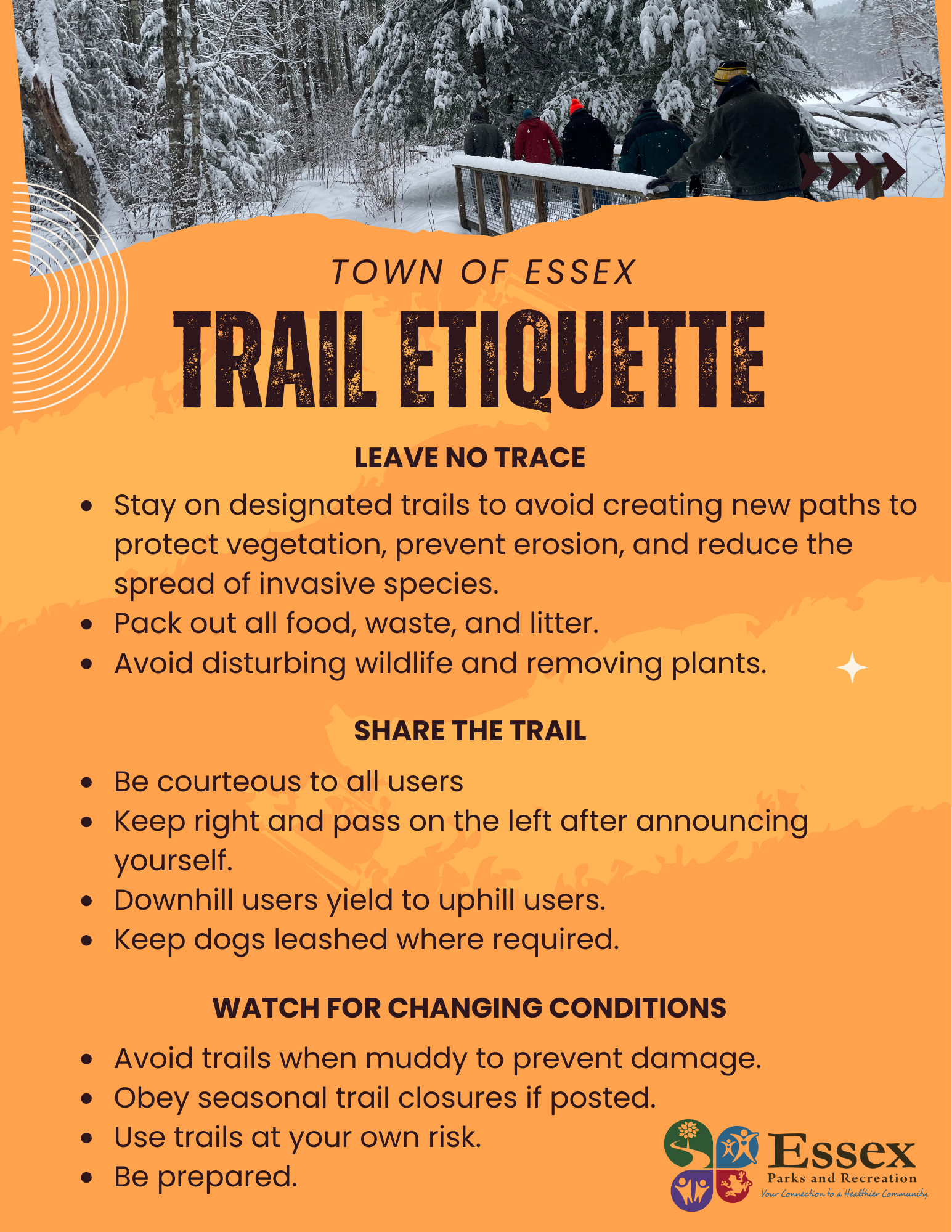 Welcome to the Town of Essex trail system! Essex has over 40 miles of public trails for hiking, biking, horseback riding, snowshoeing, birding, and more. Come explore the iconic Indian Brook Reservoir, cycle on Saxon Hill, or experience the towering hemlock groves of Mathieu Town Forest. Before you head off on the trail, please be sure to take a moment to review the information posted on trailhead kiosks and be courteous of any ordinances, rules, or closures.